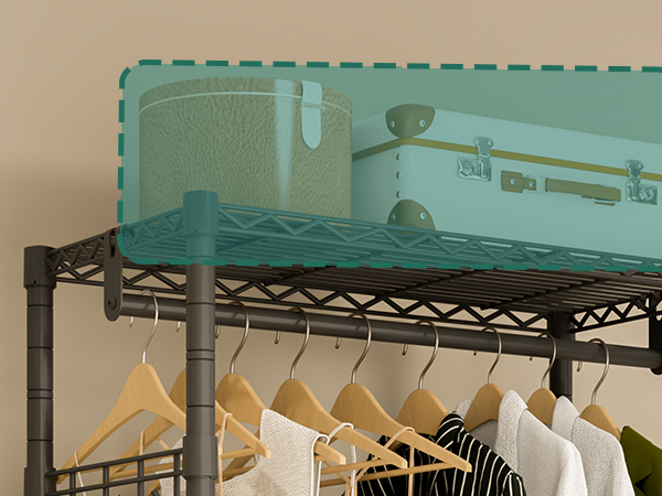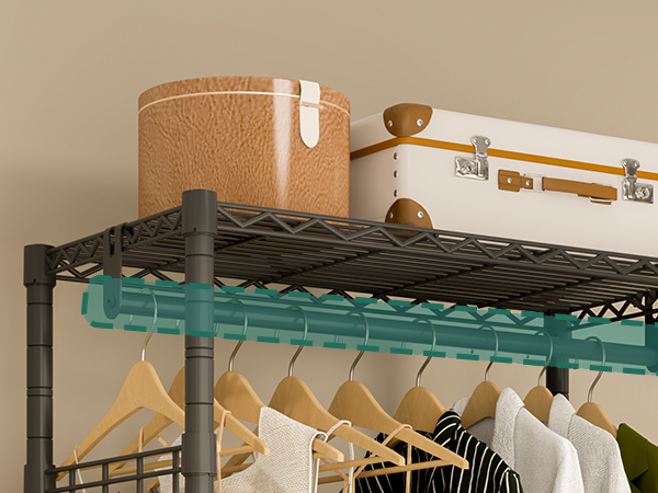 The garment rack shelves are adjustable, you can adjust the height and position according to your needs (like clothes length).