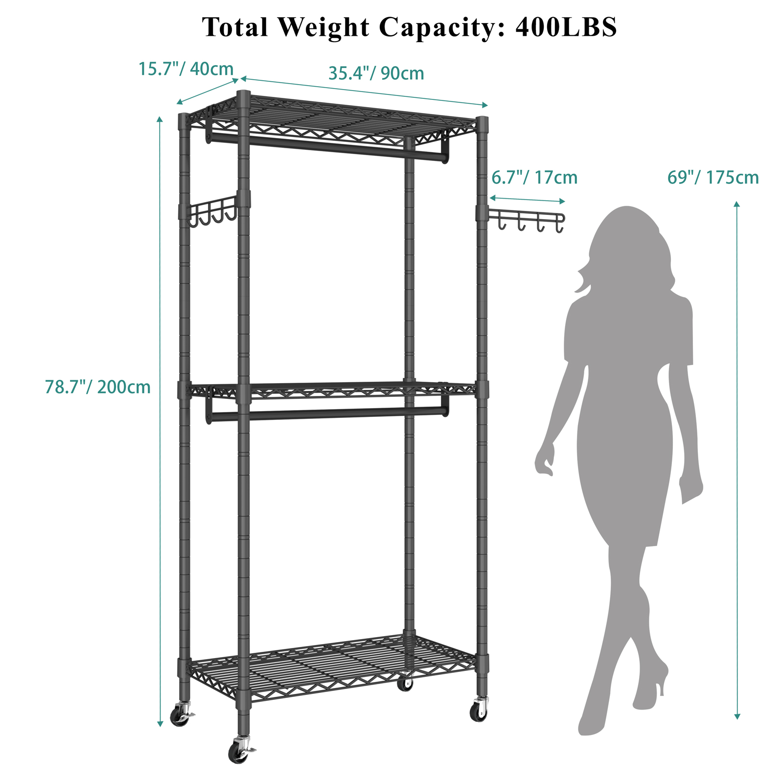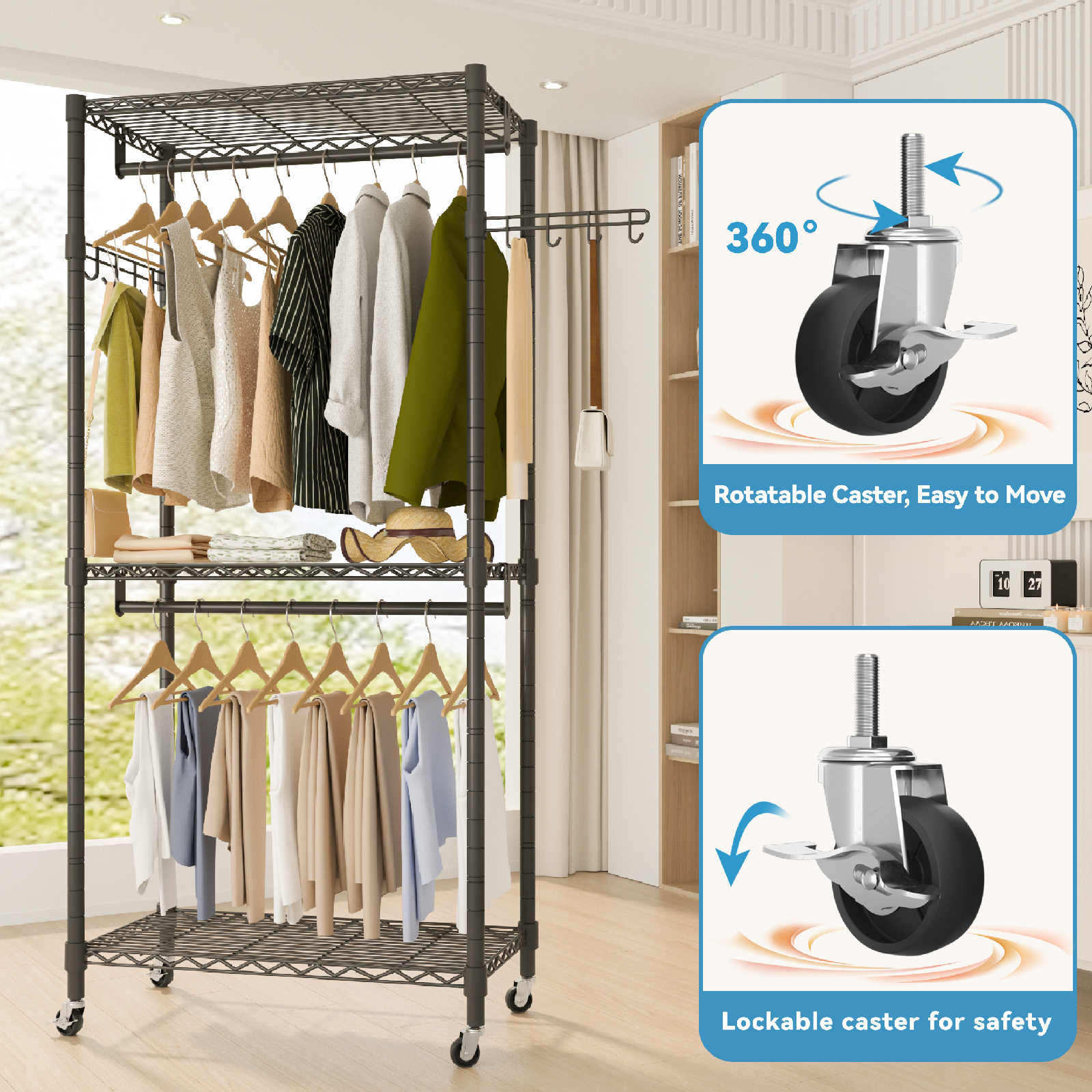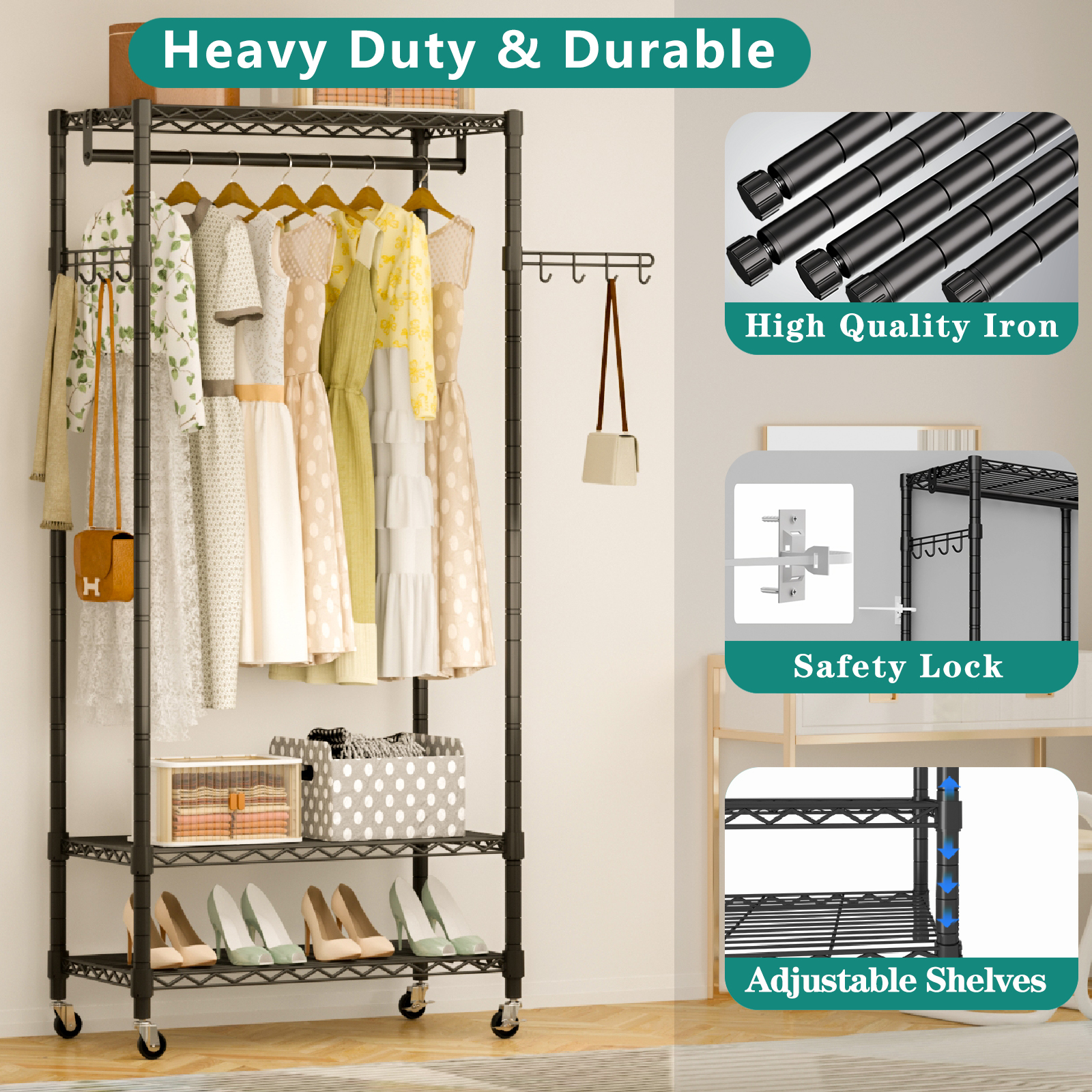 Rolling heavy duty garment rack with wheels for hanging clothes, includes three shelves for small suitcases, clothes, shoes, etc. and two hooks for hanging bags, scarves, umbrellas, etc.It is suitable for cloakrooms, apartments, dressing rooms, laundry room, school dormitories, etc.