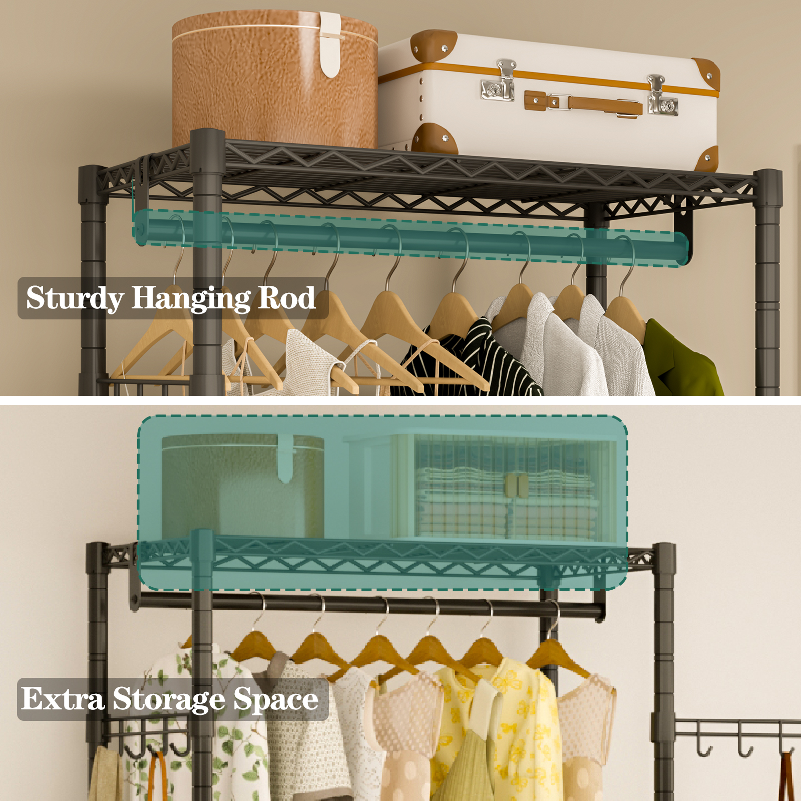 Strong and sturdy hanging rod, can hang clothes safely and securely, even heavy winter coats. Easy to find your clothes.